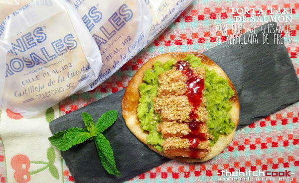 Ya metidos en faena asiática decidí lanzarme con el salmón (uno de los reyes del mar) y cocinarlo en modo de tataki. El tataki es una técnica que consiste básicamente en macerar previamente el producto - carne o pescado - y luego cocinarlo levemente en la sartén. Ese toque casi crudo del pescado, con toda la potencia de la soja y el jengibre, el frescor de un puré de guisantes aromatizado con hierbabuena y un chizpazo final de dulzor extra con la mermelada de fresas, son unos grandes actores secundarios de la gran estrella: la torta. En este caso una Torta-taki.