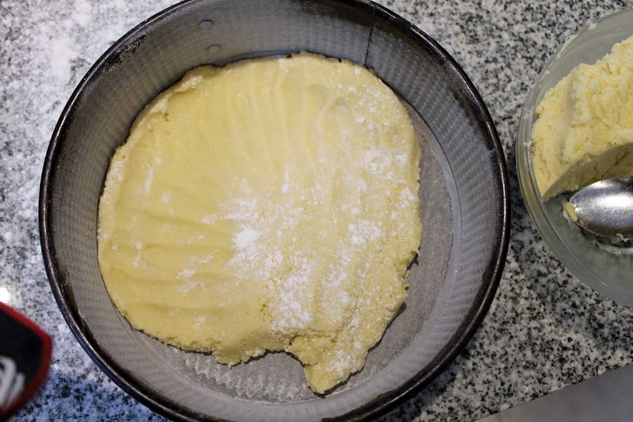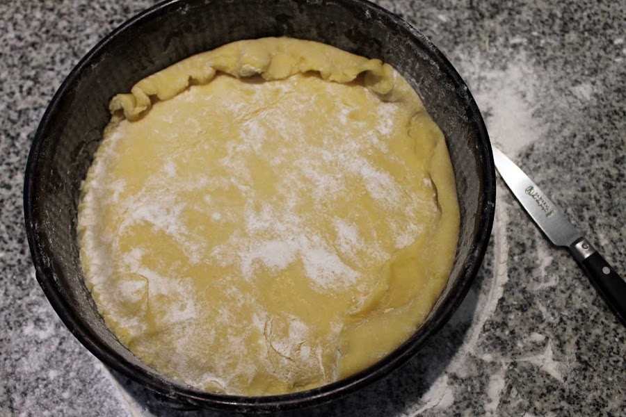 - Estirar sobre la mesada enharinada el resto de la masa, formando un disco del diametro del molde