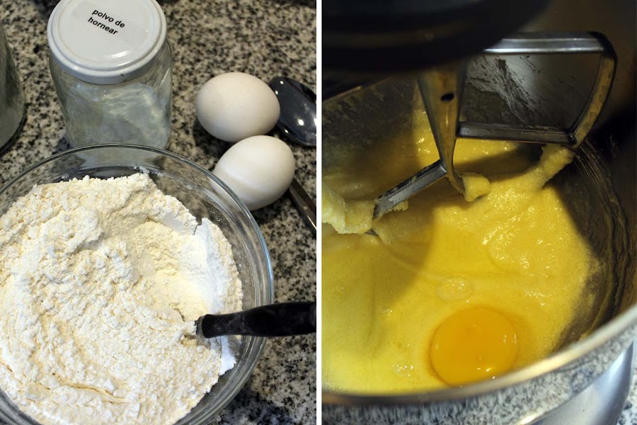 - Mezclar el azucar con la harina, y agregar 2 huevos, y mezclar