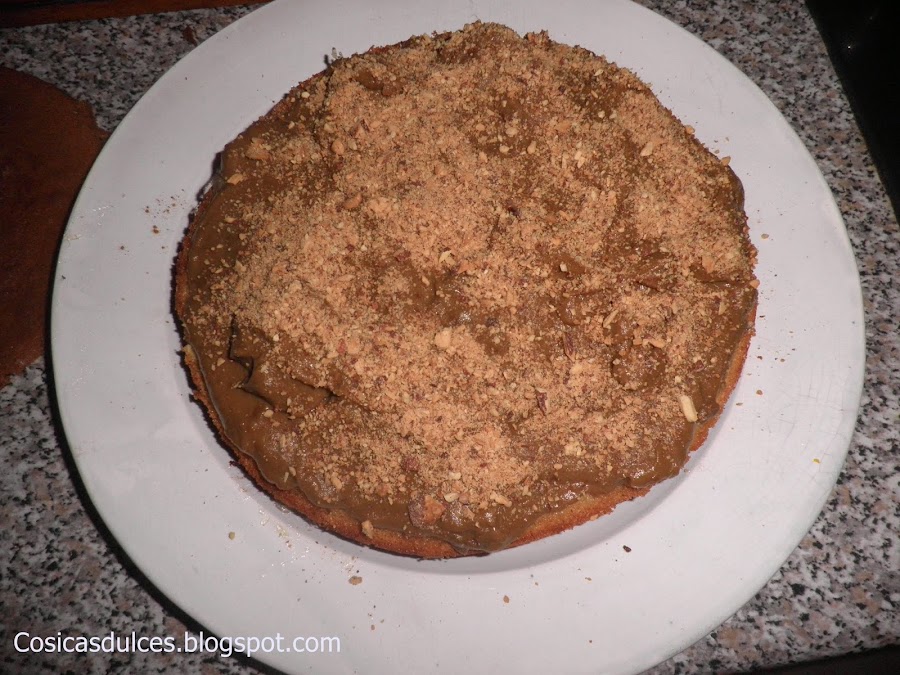 Cortamos el bizcocho en tres discos y en todos ellos repetimos la misma operación: almíbar, cabello de ángel, canela, crema y almendra.