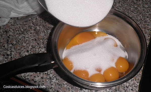 Preparación del merengue: Colocamos en un cazo las claras y el azúcar y ponemos en el fuego hasta lograr que alcance una temperatura de 60 grados. Si no disponemos de termómetro basta con que al tocar la mezcla con los dedos no nos quememos y apreciemos que se ha disuelto el granillo del azúcar. Posteriormente pasamos la mezcla a un batidor de varillas y batimos hasta lograr un merengue bien firme.