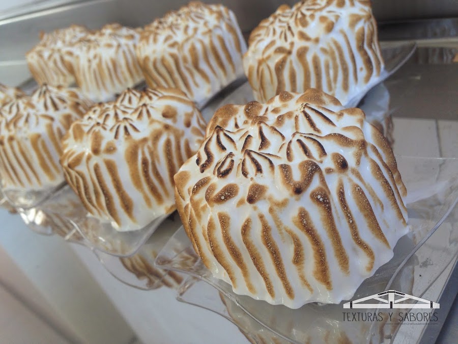 Cortar los bizcochos plancha (debe de salir tres capas) con un molde metálico, colocar el primer disco y bañar con el almíbar que hemos preparado anteriormente. Rellenar con crema pastelera, colocar una buena capa de cabello de angel, sobre este, colocar el segundo disco de bizcocho, bañar con almíbar y rellenar otra capa de crema pastelera. Bañar el tercer disco y colocar encima. Cubrir en forma de estrella con merengue italiano. Tanto en la ultima capa como en los laterales. Con un soplete tostar el merengue.Este es el resultado final de la tortada cartagenera en version individuales