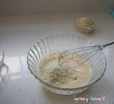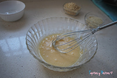 Agregamos la harina de almendra y la levadura y seguimos batiendo.