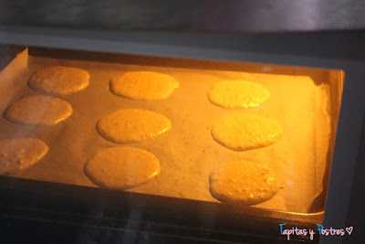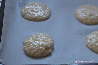 En una bandeja con papel de horno, ponemos cucharadas de la mezcla. Aquí debo deciros que en el horno crecen mucho, así que haced montoncitos pequeños. Se me olvidaba, aunque pongais papel de horno, engrasadlo un poco pues si no se pegan.