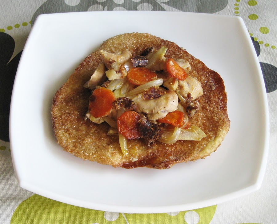 Coloca el pollo con salsa de soja sobre cada una de las tortas de naranja y añade el pan de dátiles cortado en trocitos por encima.