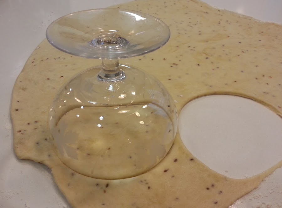 2. - Extendemos con el rodillo la masa dejándola lo más fina posible y cortamos con una copa grande.