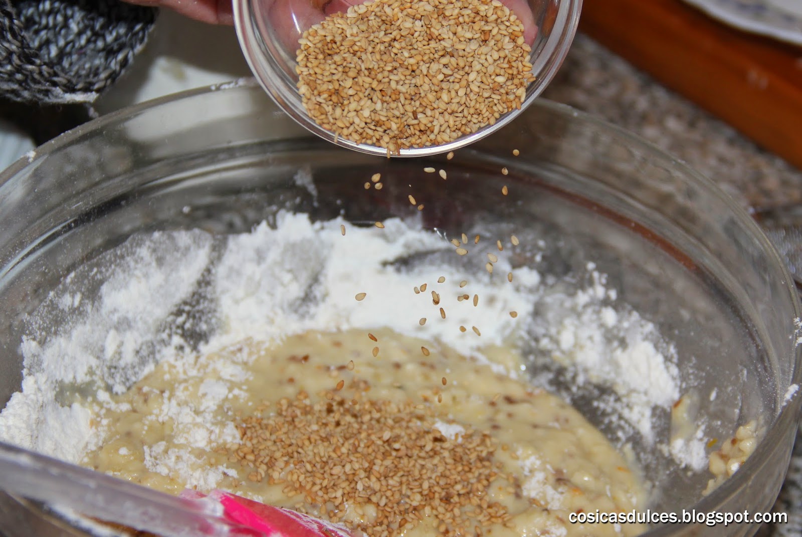 Incorporamos la mitad de la harina y cuando esté mezclada añadimos las semillas de ajonjolí.