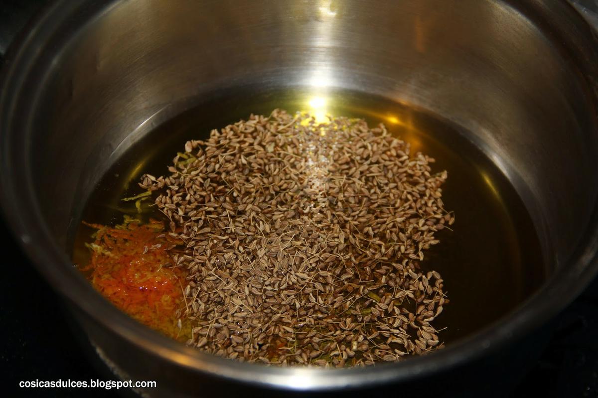 En un cazo ponemos el aceite de oliva, la ralladura de limón y naranja y el anís en grano. Lo calentamos muy ligeramente (no tiene que llegara a humear, ni siquiera a quemar).