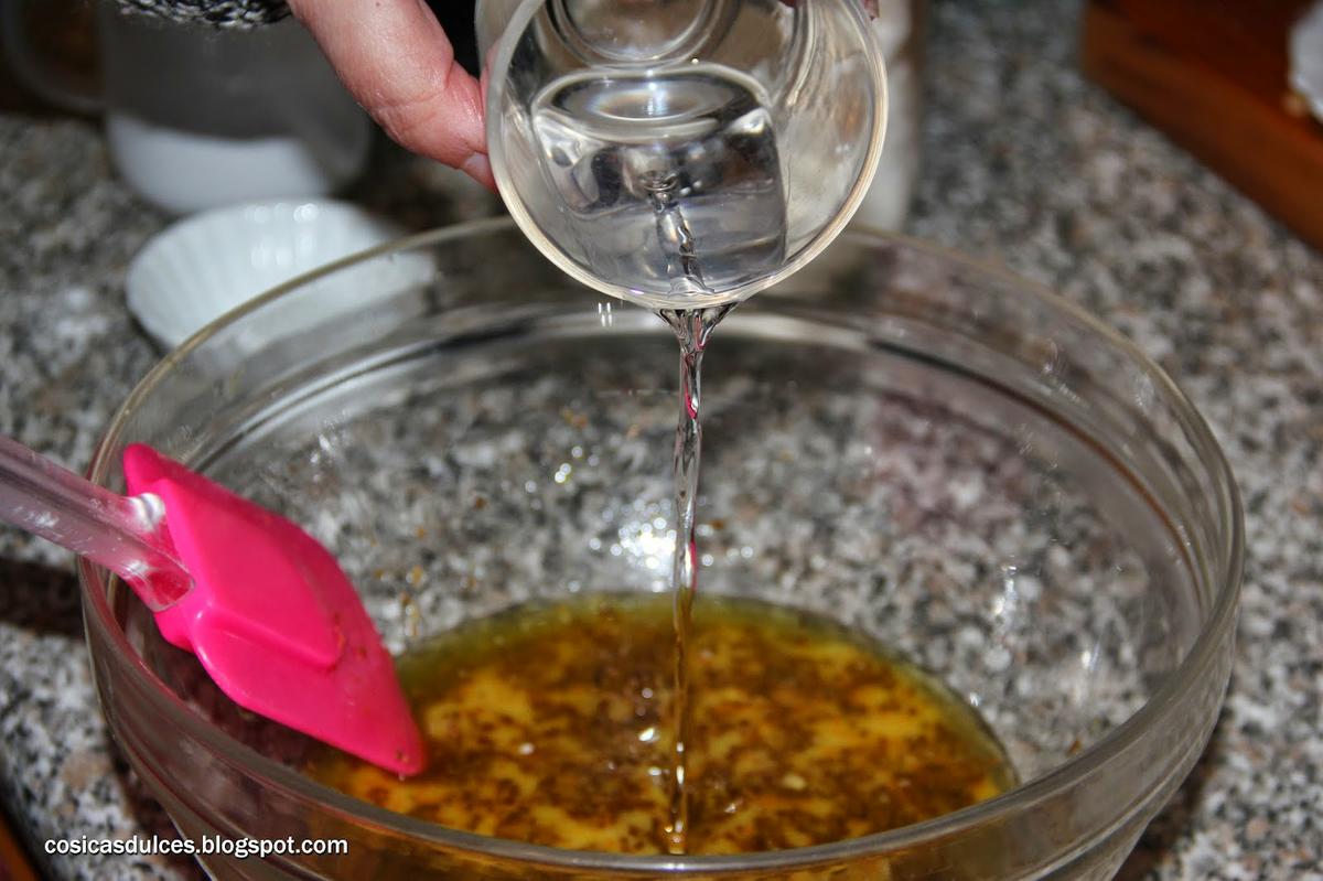 Vertemos el aceite, junto a las ralladuras y el anís en grano ligeramente caliente en un bol y vertemos sobre él el agua, el anís líquido y la levadura desmigada y movemos bien hasta que se disuelva.