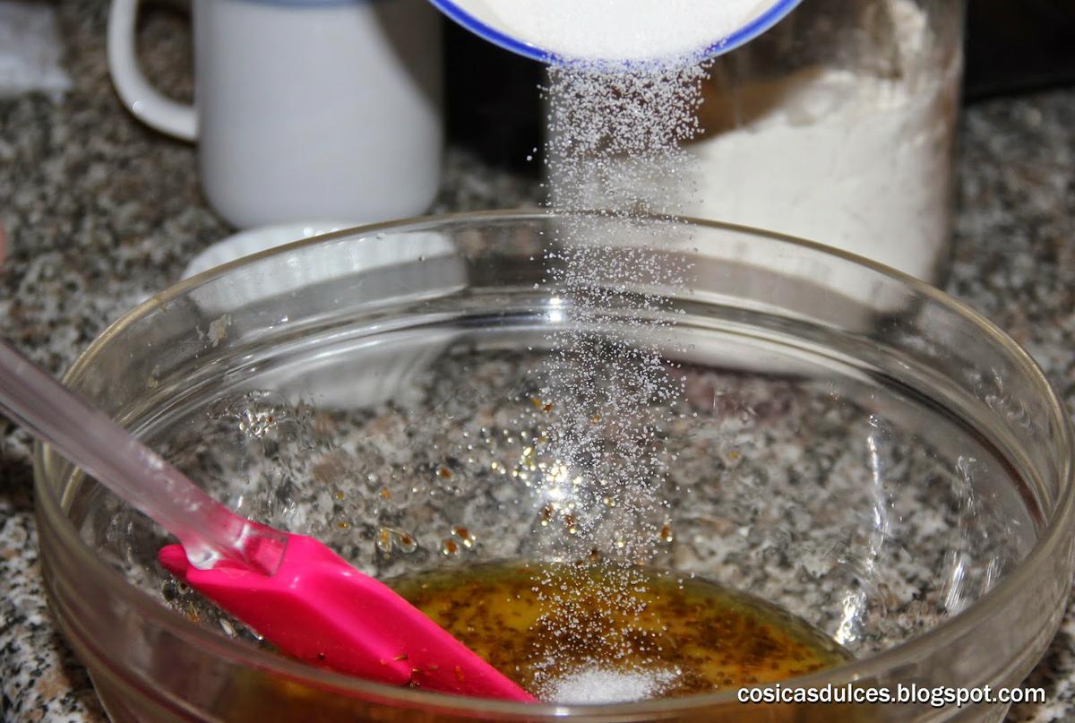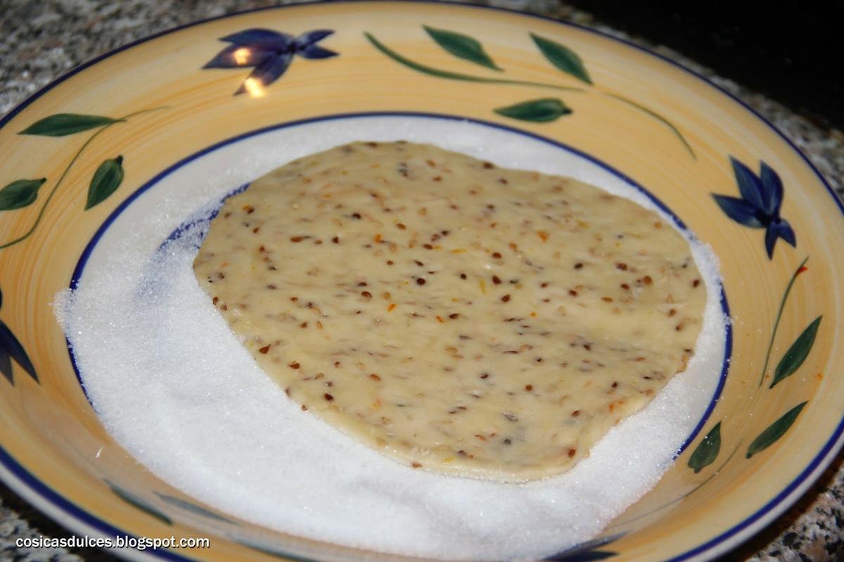 Pasamos una de las caras de la torta por un plato con azúcar en grano.