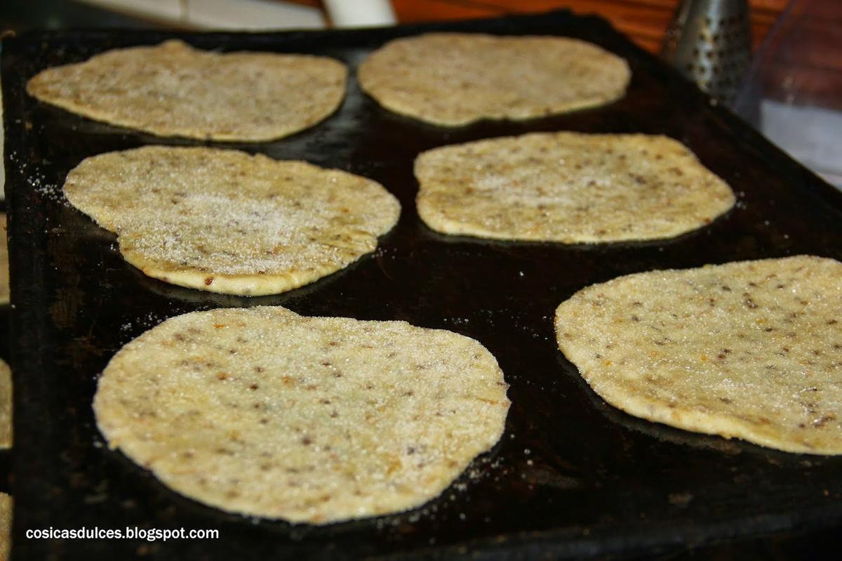 Colocamos las tortas en una bandeja (con la cara azucarada hacia arriba, lógicamente) y horneamos a 220º ente 6 y 8 minutos (sin dejar de vigilar que por experiencia os digo que se queman en un segundo).