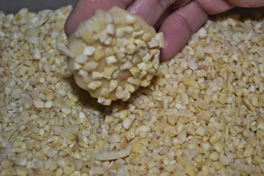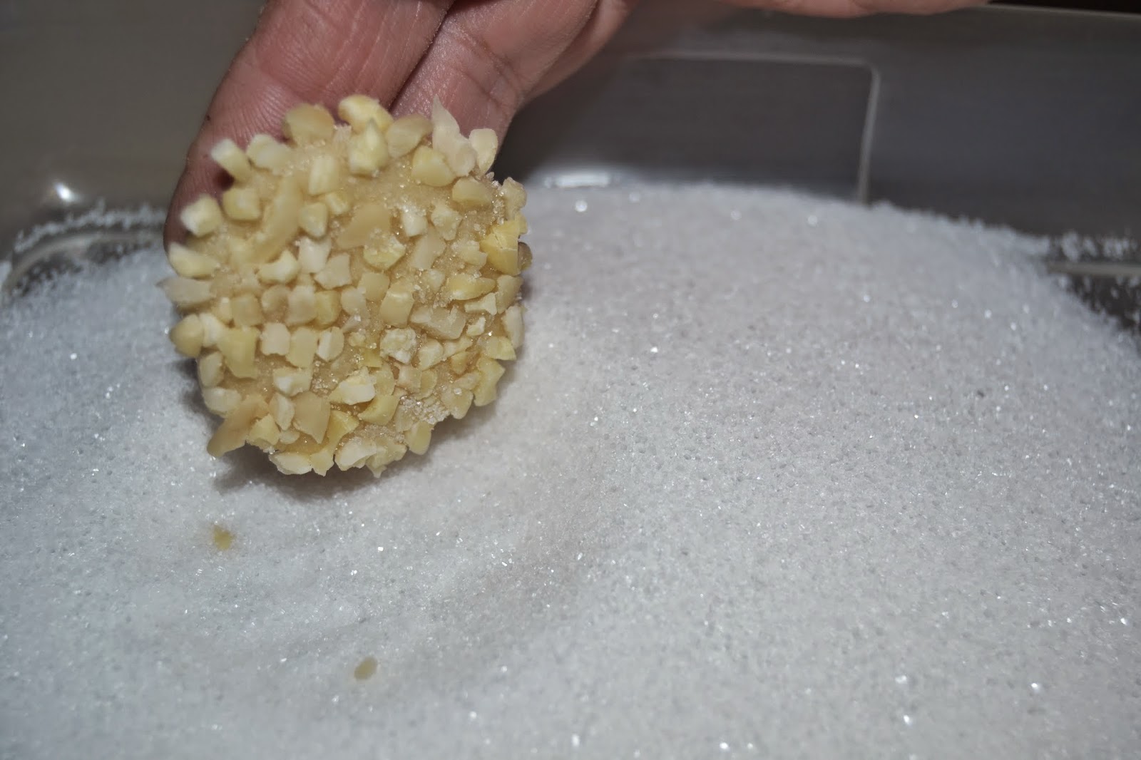 A continuación las pasamos por la almendra primero y después por azúcar, presionando un poco para que la almendra y el azúcar se queden adheridas. Nos podemos mojar un poco los dedos con huevo batido y esto hará que la torta se fije a nuestros dedos y no se nos caiga al untarle la almendra y el azúcar, esto es mas fácil de lo que parece.