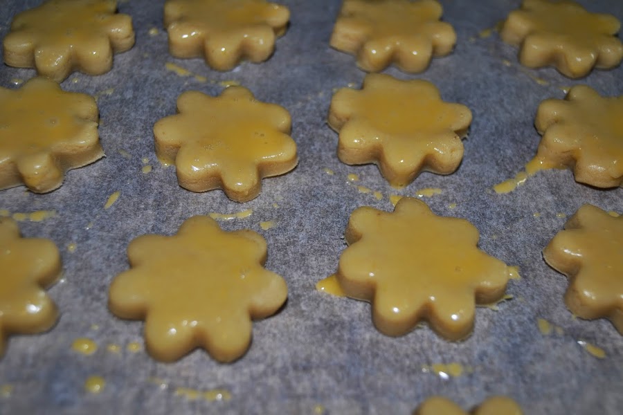 A continuación nos disponemos a elaborar las tortas, cogemos porciones de masa y con el rodillo las extendemos de un cm. mas o menos. Cortamos con un cortapastas y las disponemos en una bandeja de horno con papel. Untamos las tortas con huevo batido por encima con una brocha.