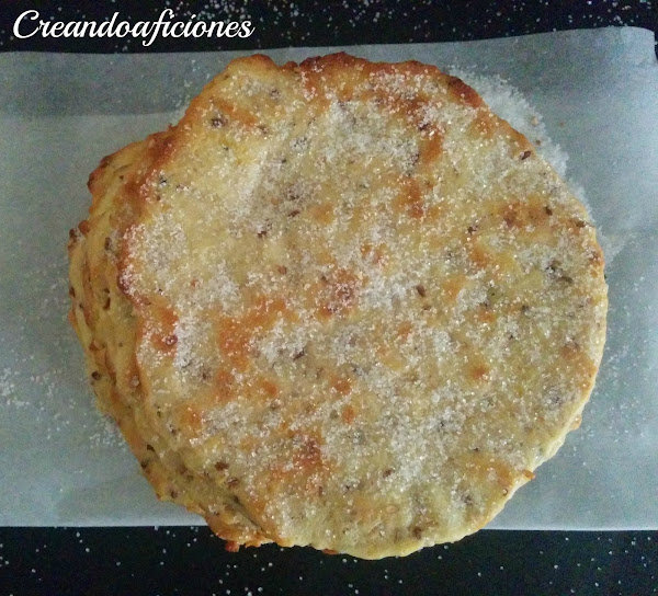 Vamos a coger trozos de la masa y la vamos a estirar con la ayuda de un rodillo, lo más fino posible. Ponemos un plato de postre encima para hacer la forma redonda de las tortas y espolvoreamos con azúcar. Lo colocamos en la placa del horno con papel vegetal.