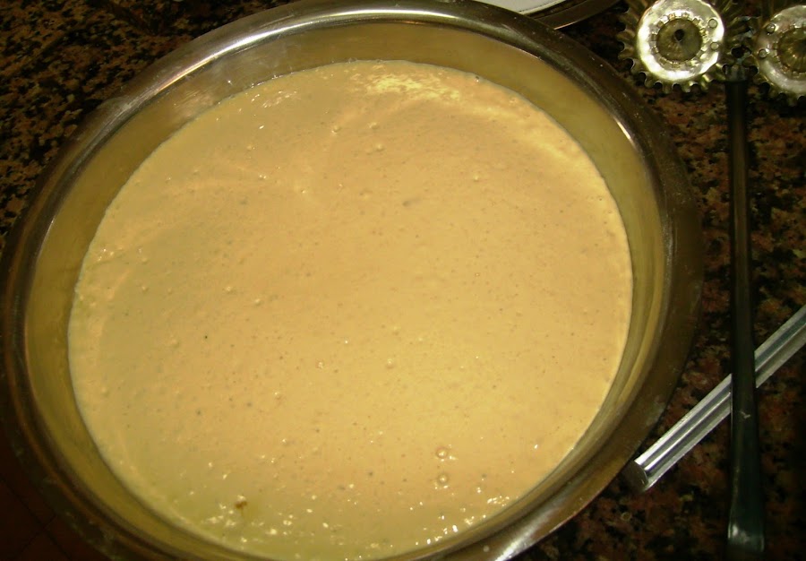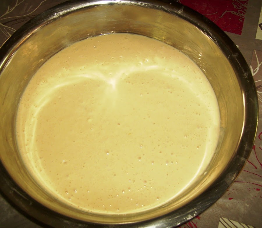 Preparación:Batir los huevos,añadir la leche templada, la levadura disuelta en el vaso de agua templada,la pizca de sal y la harina. Mezclar todo y dejar la masa tapada en un sitio cálido ,hasta que crezca.