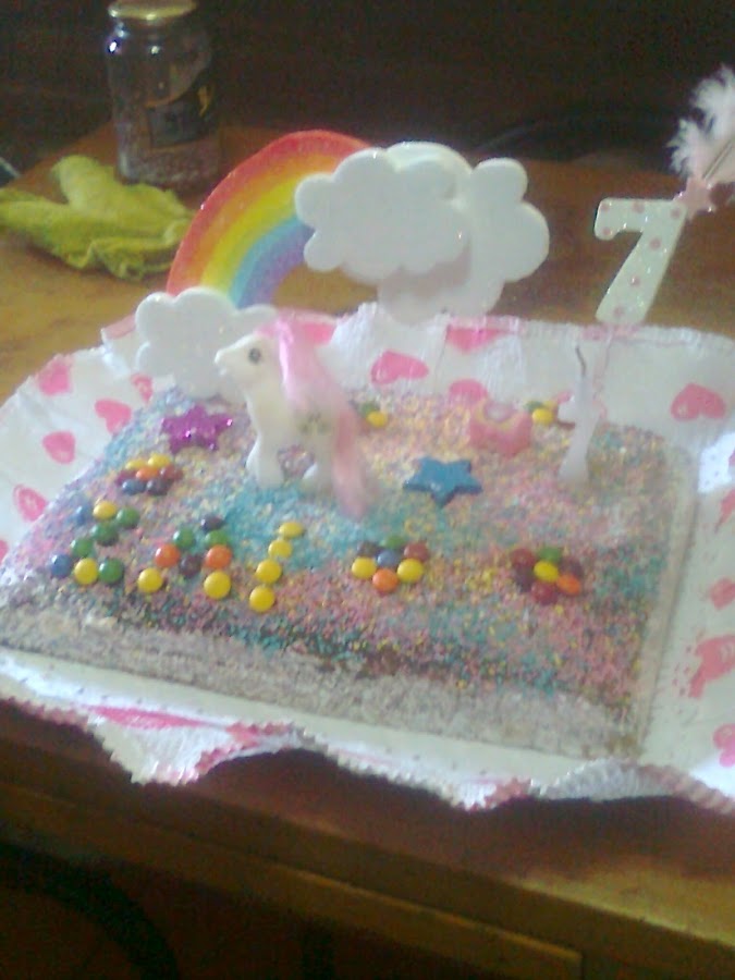 Torta Rectangular, bizcocchuelo arcoiris concentricos los colores rellena con dulce de leche y duraznos, cubierta de coco y golosinas, motivo pequeño pony