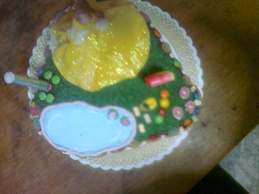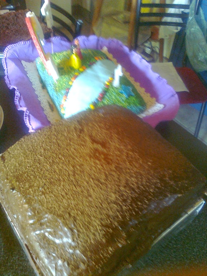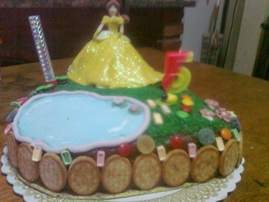 Esta, jejeje si como lo ven es lo que quedó al momento de la foto porq ni foto me dejaron sacar en la escuela los peques, Torta doble con trocitos de chocolate rellena con dulce de leche y merengues triturados, cubierta con chocolate cobertura blanco motivo Violetta aunq ni se note ya jejejejeje
