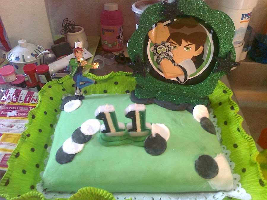 Torta Rectangular cubierta con fondant, rellena de dulce de leche, durazno y merengue, motivo de Ben 10,no de Villa Mitre equipo de fútbol! jejejeje encima es hincha de Independiente!