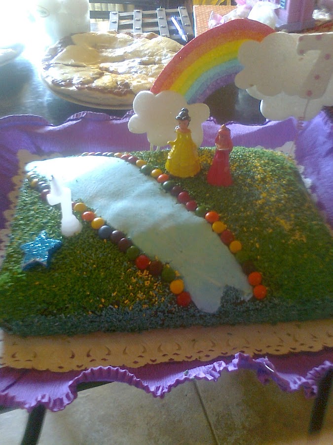 Torta Rectangular, bizcochuelo en capas de colores arco iris rellena de dulce de leche y merengues cubierta con coco y golosinas, motivo princesas.
