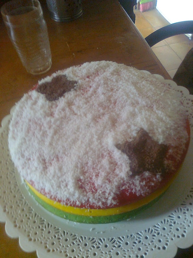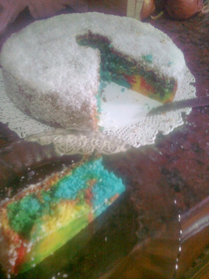 Bizcochuelo esponjosos Arco Iris, cubierta de dulce de che y coco blanco