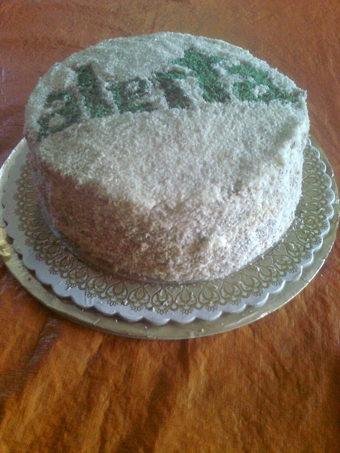 Bizcochuelo tipo Regge, cubierta de coco y cacao amargo.