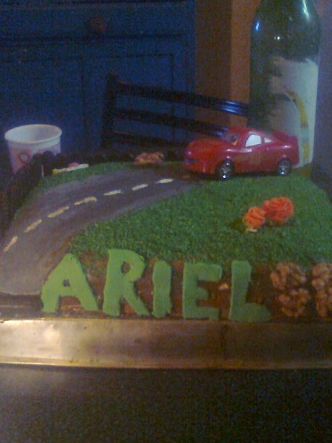 Torta Rectangular, cubierta de coco y golosinas, rellena de dulce de leche y merengues, motivo Cars
