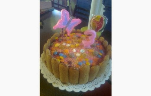 Torta con doble relleno: dulce de leche y merengues y dulce de leche y duraznos, cubierta de granas de colores y golosinas, y vainillas, motivo infantil para nena.
