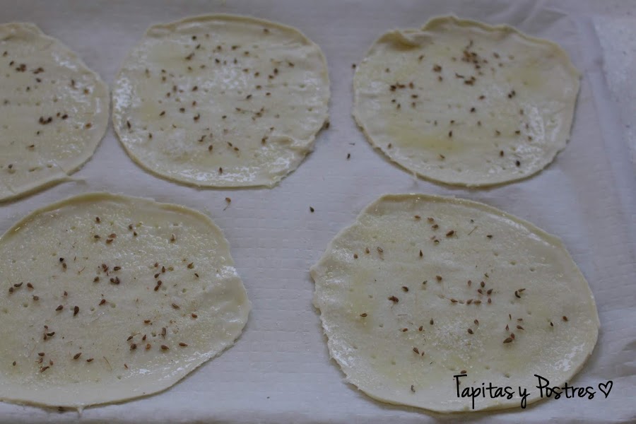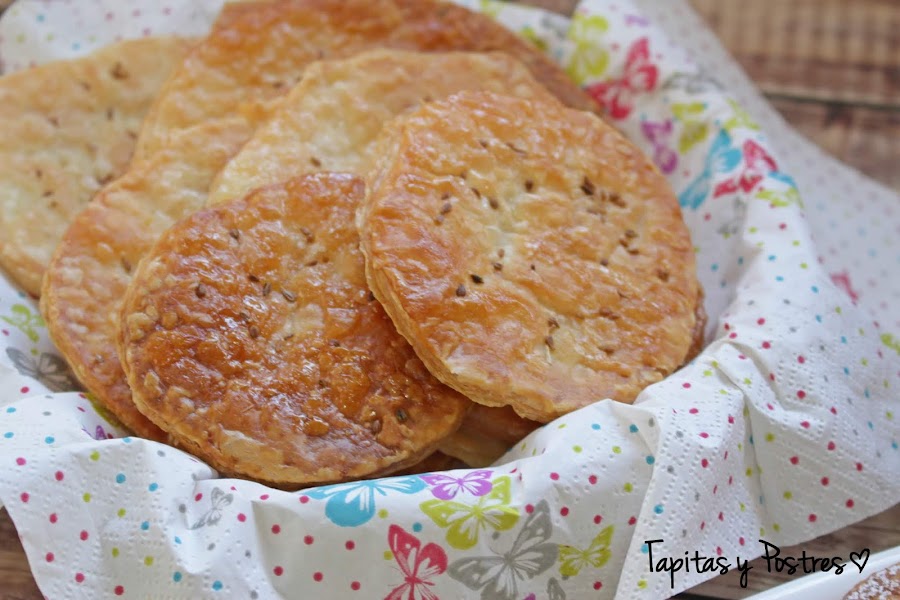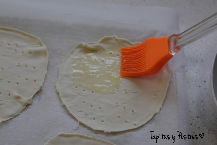 Extendemos las planchas de hojaldre y cortamos círculos del tamaño que queráis. Yo usé un cuenco y quedaron grandecitas pero también hice tortas más pequeñas con el borde de un vaso. Esto va en gustos.