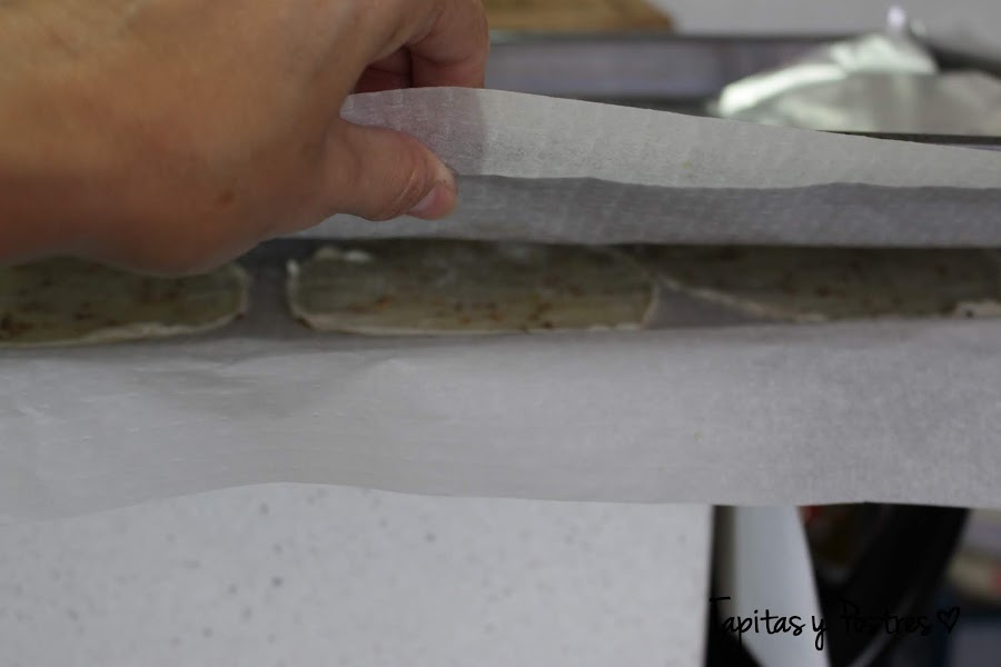 Ahora tenemos que poner algo de peso encima para que no suban al hornearlas. Yo puse un papel vegetal encima de las tortas y sobre eso una bandeja de horno que las aplastaba por completo. Así al hornearlas no suben y quedan más crujientes.