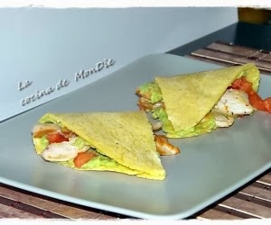 La pechuga se corta en tiras, poner a punto de sal y saltear junto con el ajo picado a fuego vivo, reservar. El tomate se pela y trocear en dados pequeños y también se reserva. Machacar con un tenedor el aguacate, añadir una pizca de sal y mezclar todo con el zumo de medio limón.