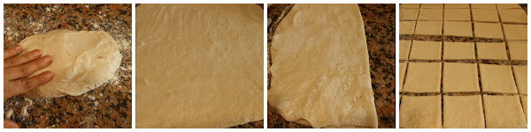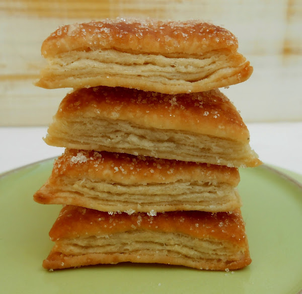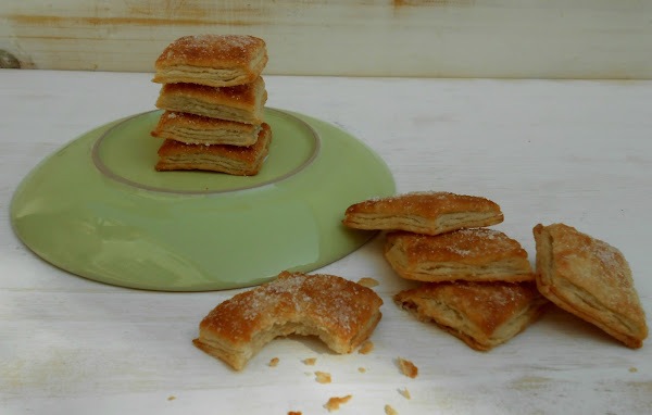 Enharinamos la encimera y estiramos la masa con rodillo, dandole forma rectangular. Untamos con manteca (grasa) y espolvoreamos azúcar, doblamos la masa sobre si misma, estiramos nuevamente y volvemos a untar con manteca y espolvorear con azúcar. repetimos esta operación hasta terminar la manteca. Cortamos cuadrados, espolvoreamos con azúcar y cocinamos a 180º durante 25 minutos o hasta que estén dorados.