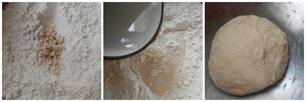 Ponemos en un bol la harina con la sal y hacemos un hueco en el centro donde añadiremos la levadura troceada, agregamos un poco de agua templada y dejamos descansar 10 minutos hasta que la levadura espume. Pasado ese tiempo, comenzamos a añadir el agua restante integrando bien los ingredientes. Volcamos la masa en la encimera (mesada) enharinada y amasamos bien hasta obtener una masa suave que no se pega a los dedos. Ponemos un poco de harina en el bol y colocamos allí la masa. Cubrimos con papel film o con una bolsa y dejamos descansar en un lugar cálido aproximadamente 1 hora.