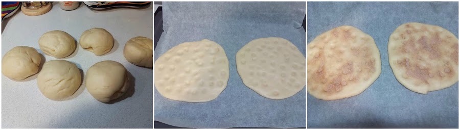 Pasado el tiempo de reposo, sacamos la masa del bol, desgasificamos un poco y la dividimos en 6 porciones de unos 180 g aproximadamente. Boleamos cada porción y dejamos reposar unos 10 minutos tapadas con un paño. Estiramos cada bola para darle forma redondeada y de 1 cm de grosor. Marcamos las tortas con la yema de los dedos (como en la foto), tapamos de nuevo y dejamos reposar 30 minutos más. Espolvoreamos azúcar y canela por encima y horneamos a 180º durante 20 minutos.