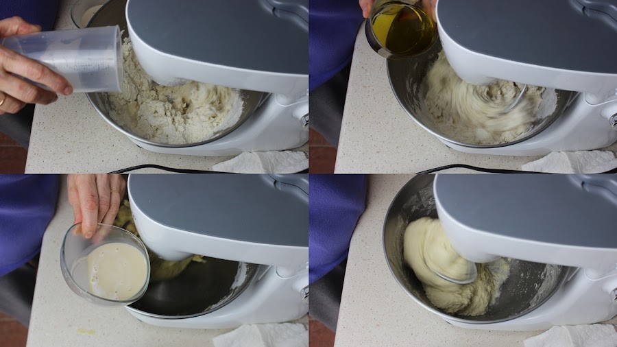 En el bol de la amasadora ponemos la harina y la sal, la mezclamos y añadimos el agua que nos quedaba fría y amasamos y ponemos los 30 ml de aceite, amasamos y añadimos el agua con la levadura y amasamos durante 3-4 minutos. Hasta que se forme una masa uniforme y elástica.