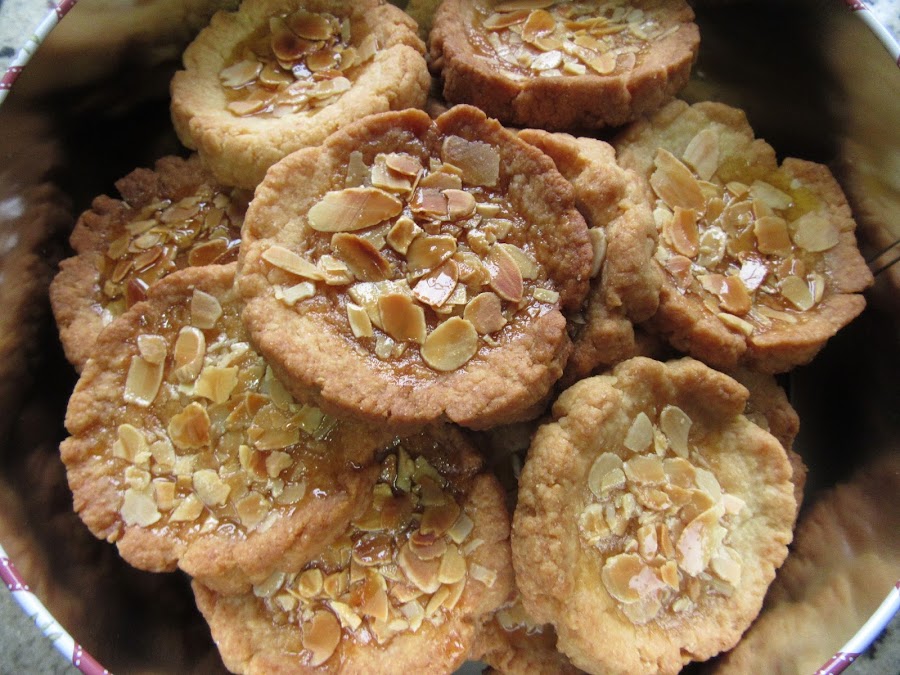 En caliente, recién salidas del horno, poner en el centro una cta. de la mezcla de miel, oiréis un chisporroteo. Dejar enfriar y conservar en latas. Duran meses.