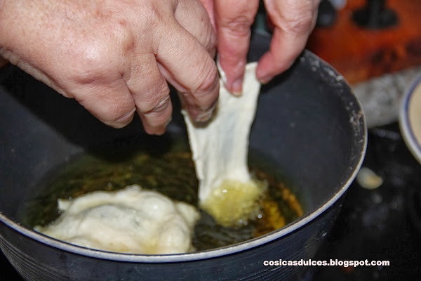 Una vez que la masa ha levado vamos tomando porciones de ella y con las manos la estiramos bien finita (hasta que casi quede transparente). Es importante mojarse ligeramente los dedos antes de tomar cada porción de masa para evitar que esta se pegue a los dedos. Freimos las tortas en aceite bien caliente.