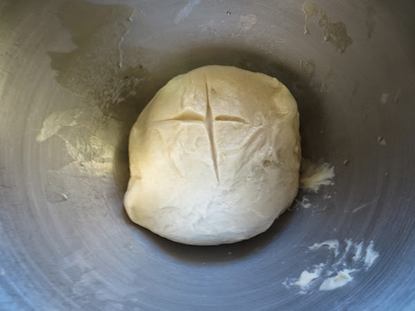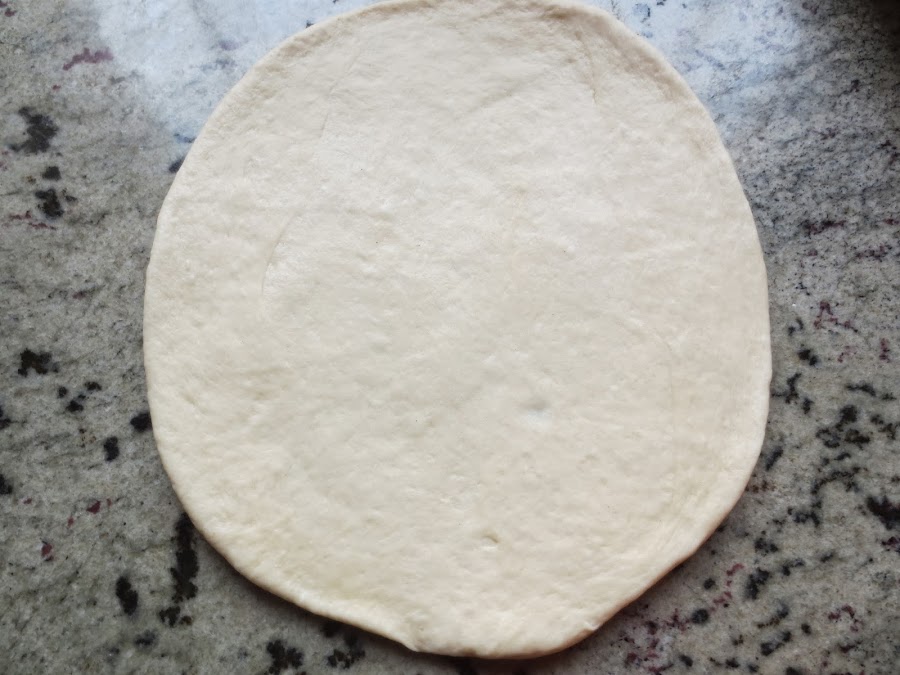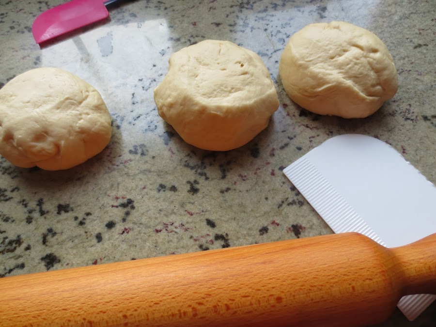 3- Con la mesa de trabajo, un poco enharinada, quitar el aire a la masa, (Desgasificar) , dividir en 3 porciones, y estirar en forma de círculo. Ir colocando en bandejas de horno, forradas con papel de hornear. Tapar y dejar levar una media hora.