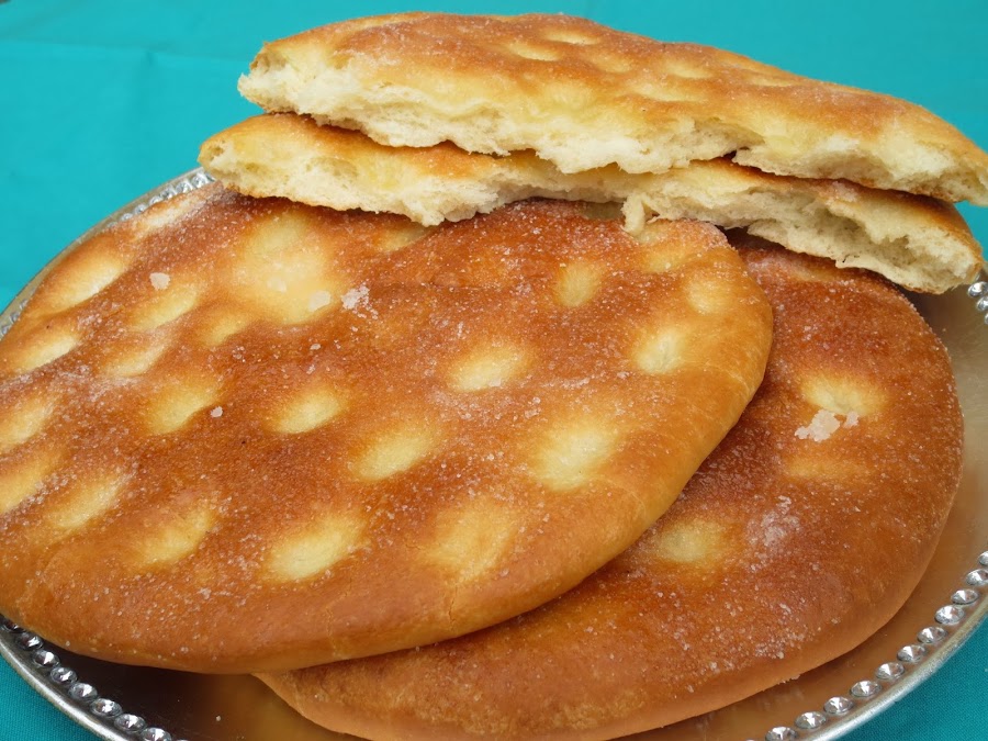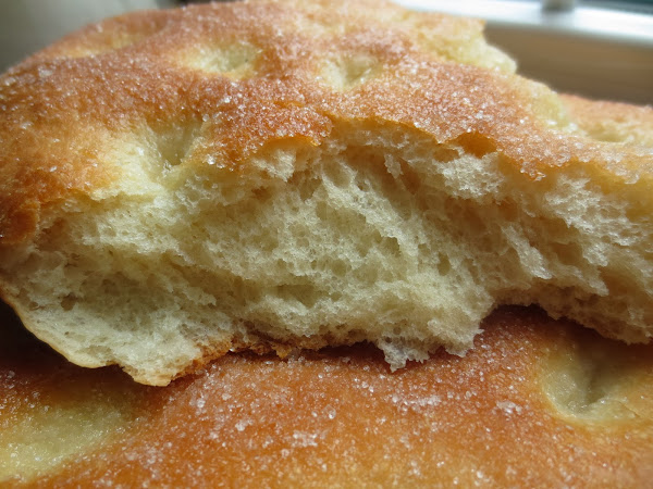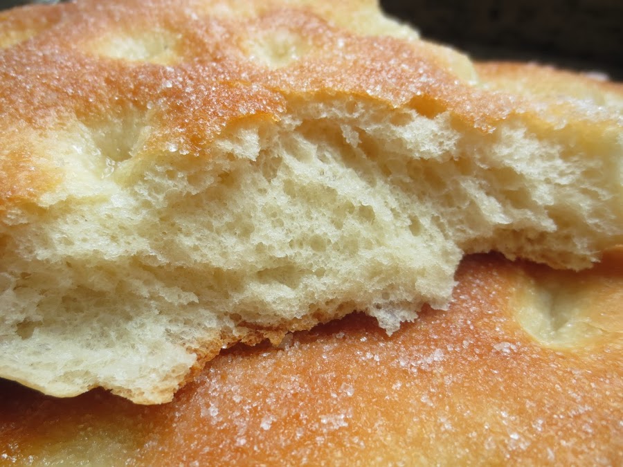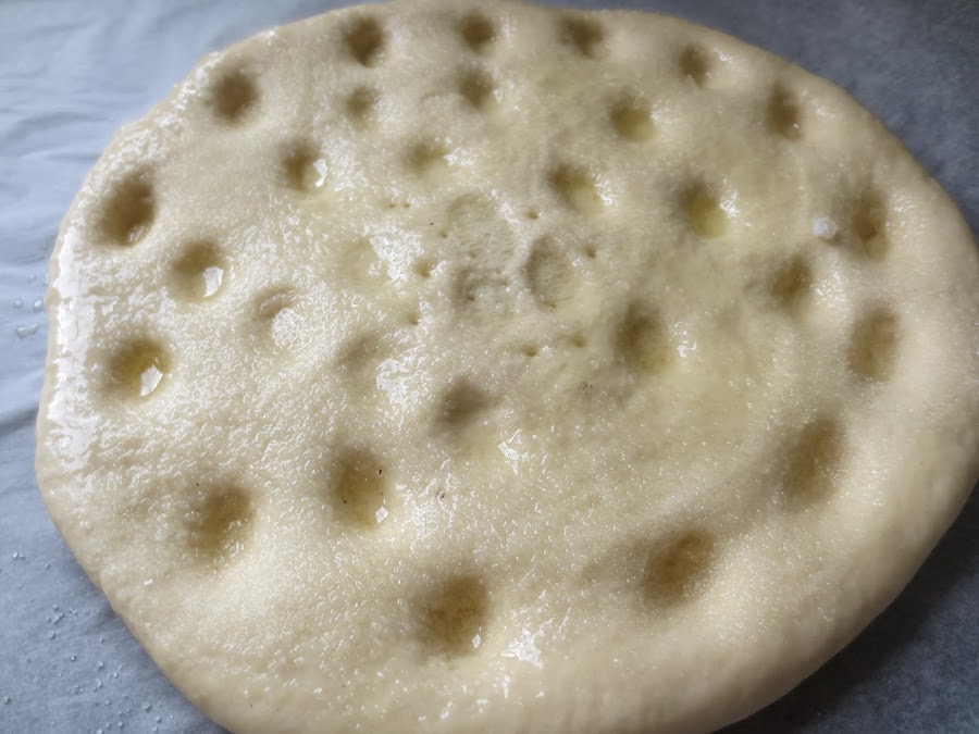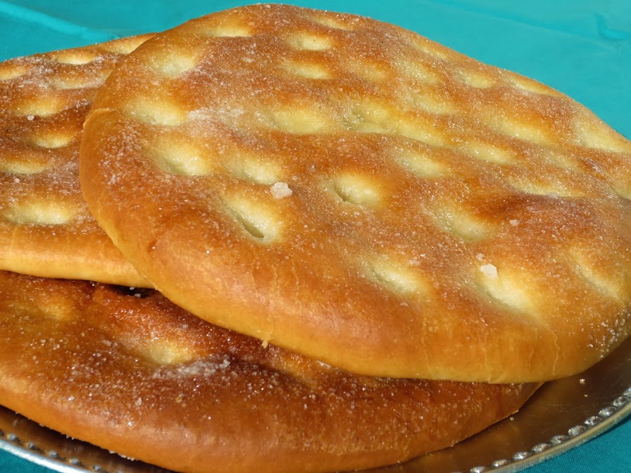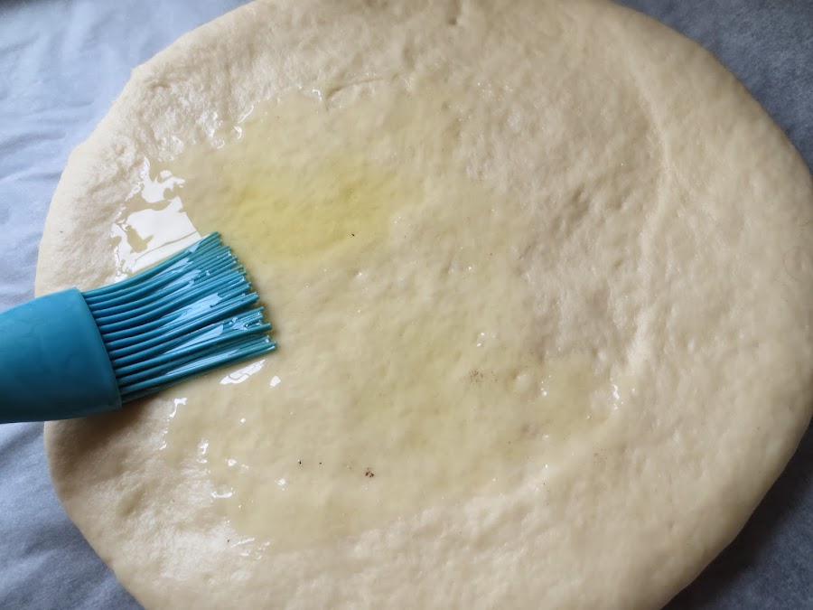 5- Pincelar las tortas generosamente con aceite de oliva, espolvorear azúcar y hacer unas hendiduras con los dedos.