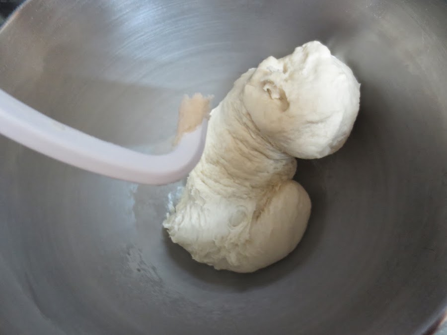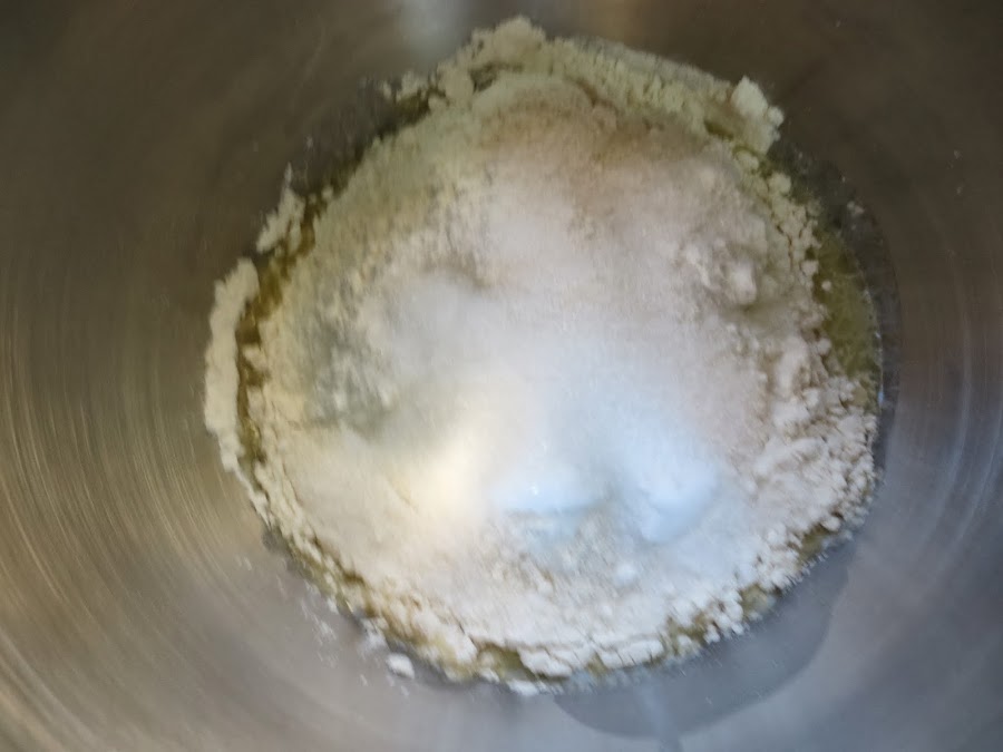 2- En el bol, mezclar la harina, azúcar y sal, añadir los líquidos y con el gancho amasador, en velocidad 1 e ir subiendo la velocidad a 4, progresivamente. Amasar unos 5 minutos, hasta que la masa se despegue de las paredes.Quedará pegajosa, es normal eh?. Formar una bola, hacer unos cortes y dejar levar tapado en un lugar cálido, hasta que doble volumen.