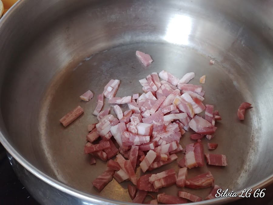 Ponemos a cocer la pasta. En un cuarto de hora estará lista. Reservamos. A la vez vamos a freír sin nada de aceite el beicon.