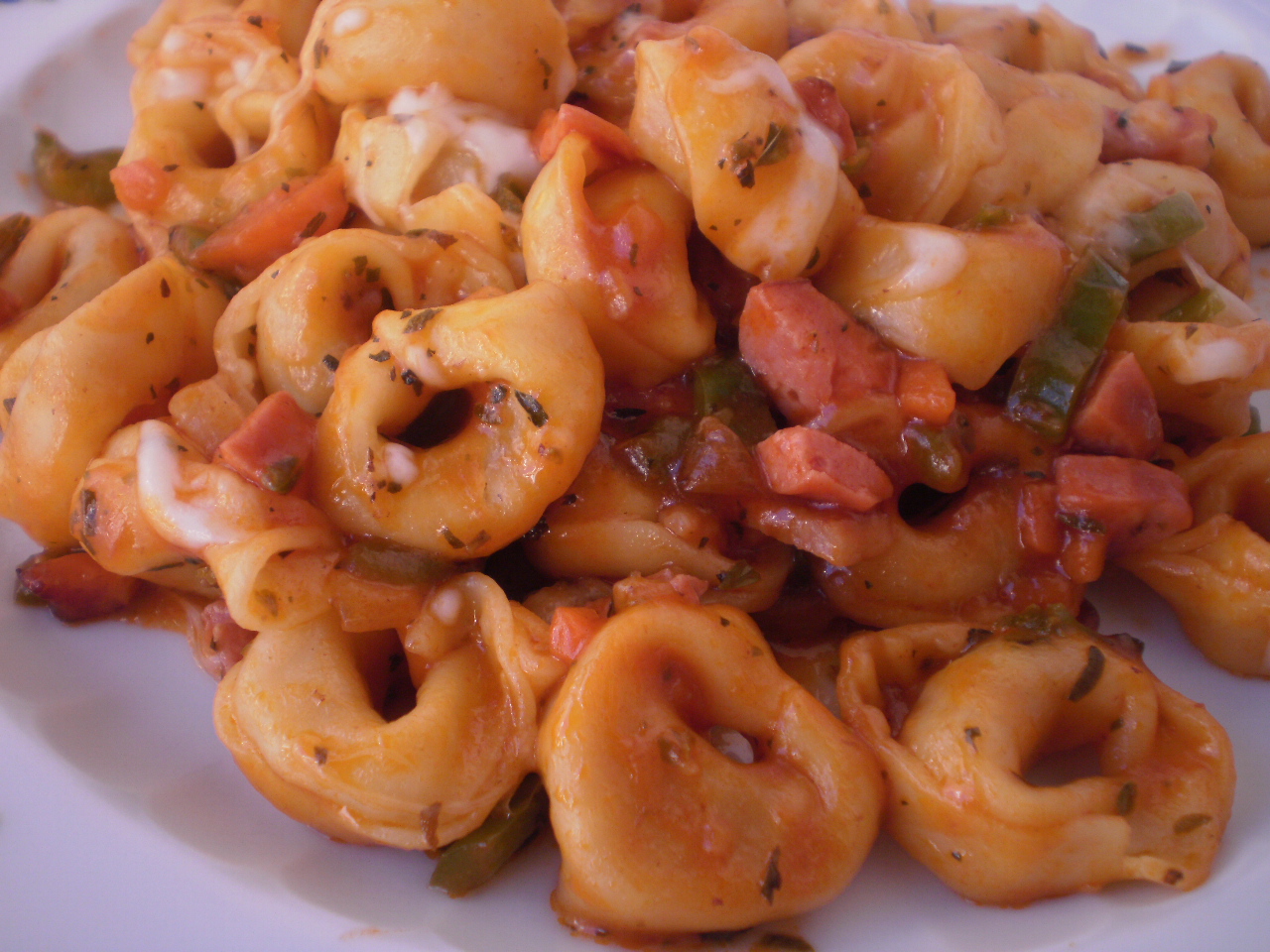 Ingredientes: Un paquete de tortellinis (en esta ocasión rellenos de pollo, la marca siempre Gallo), aceite de oliva (de Riogordo, malagueño por supuesto como debe ser en mi cocina), un pimiento verde, una zanahoria, media cebolla blanca, medio kilo de tomates maduros, cuatro o cinco champiñones, dos o tres dientes de ajo, medio vaso de vino blanco (uso un fino Montilla-Moriles), medio vaso de caldo de puchero, dos lascas de bacon, tres salchichas tipo Frankfurt, cien gramos de carne de ternera picada, orégano, albahaca, sal, azúcar y queso mozzarela rallado.