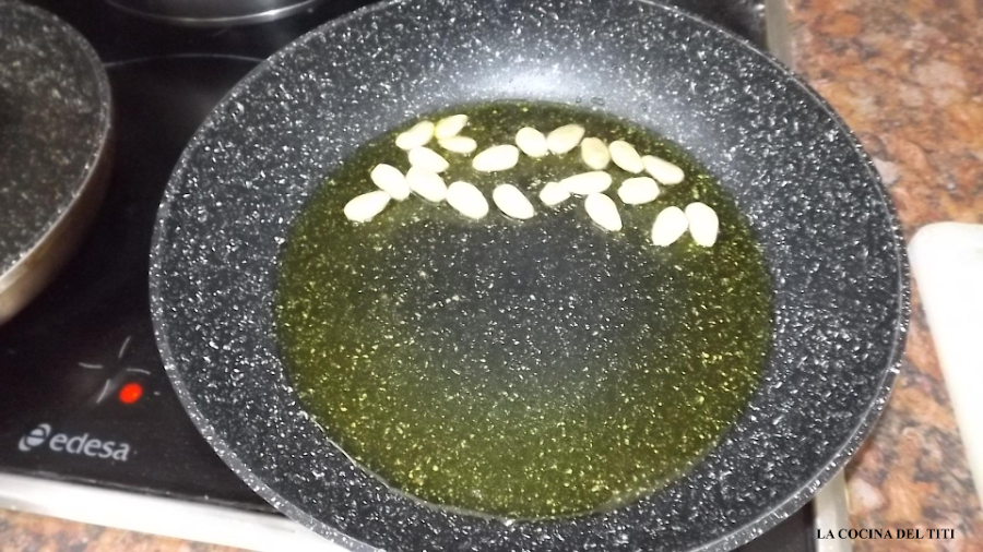 3. Por otra parte preparamos un fondo en el que primero pondremos aceite de oliva y freimos las almendras. Retiramos y reservamos