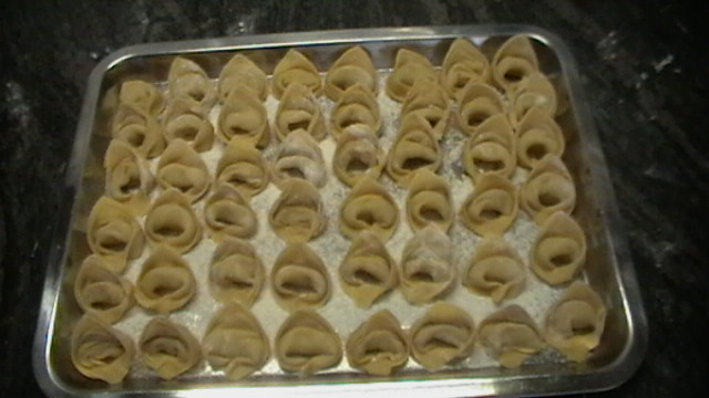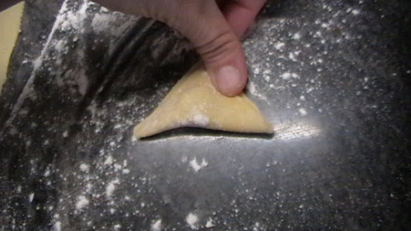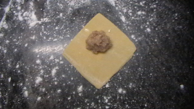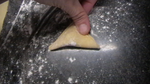 Ponemos una pelotita de carne en medio, un poquito hacia arriba..... cuidado con la cantidad, a ver si no podreis cerrarlos....... Doblamos y nos queda como un triangulo, presionamos con los dedos los bordes, para unirlos un poco...... a todo esto trabajar siempre con harina, para que no se te pegue en los dedos.....