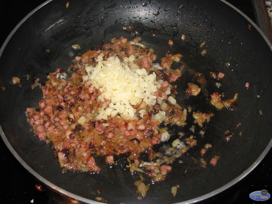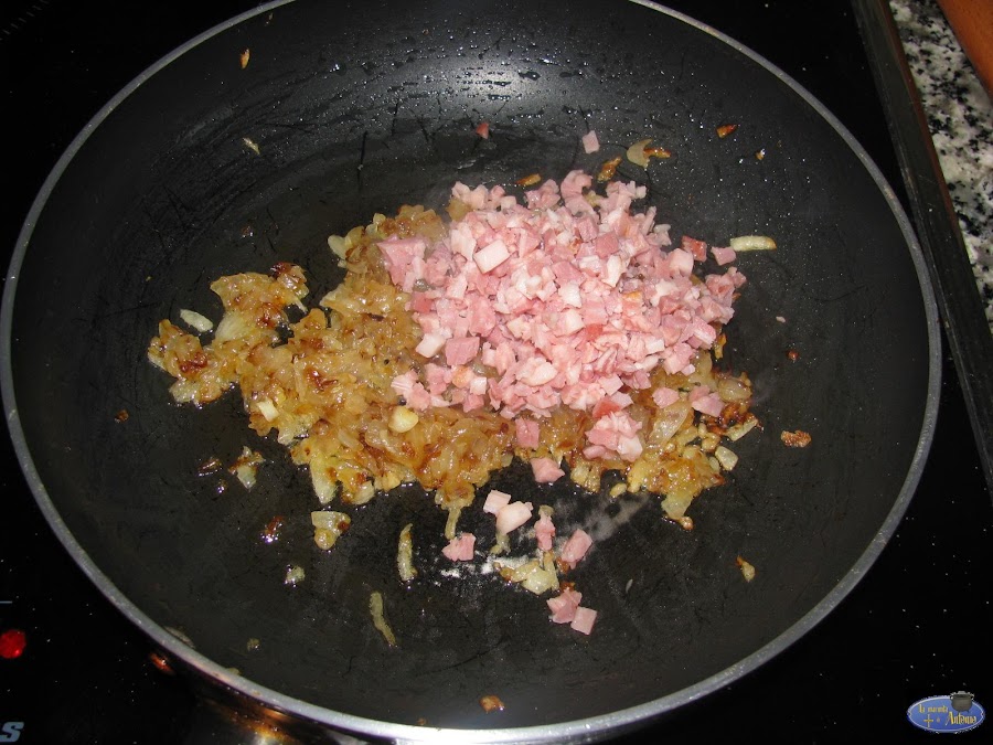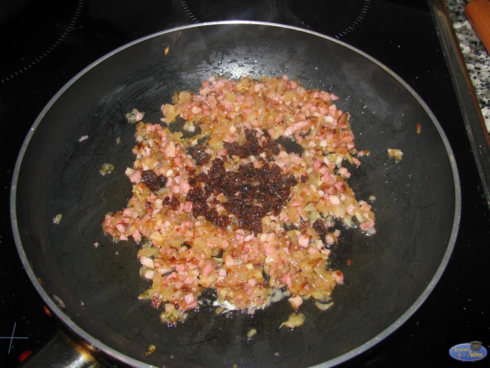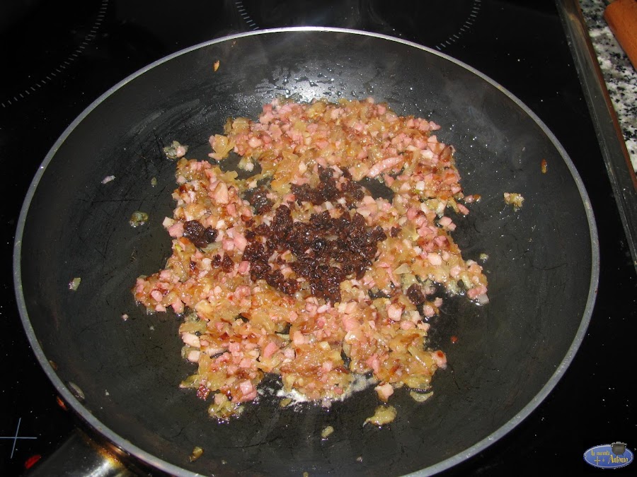 Mientras se seca,picamos bien la cebolla y la rehogamos en una sartén unos 5 minutos.Picamos el bacon y las pasas y un poco de queso.