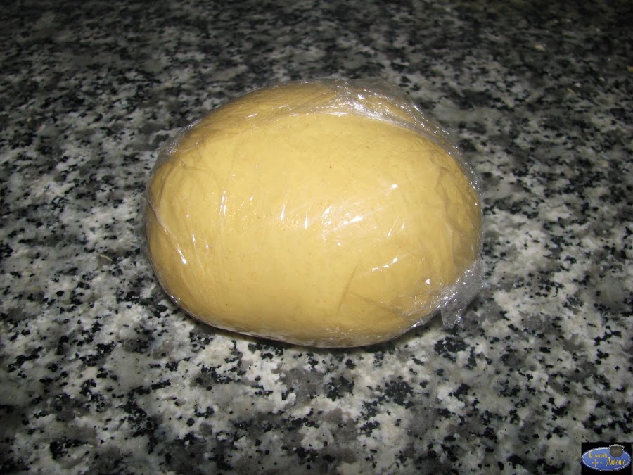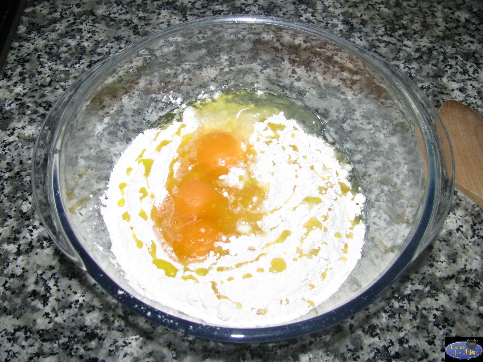 Primero preparar la masa con la harina y los huevos.Mezclamos bien y amasamos hasta tener una bola de masa lisa y brillante.La envolvemos en papel de plástico y la dejamos reposar 20 minutos.