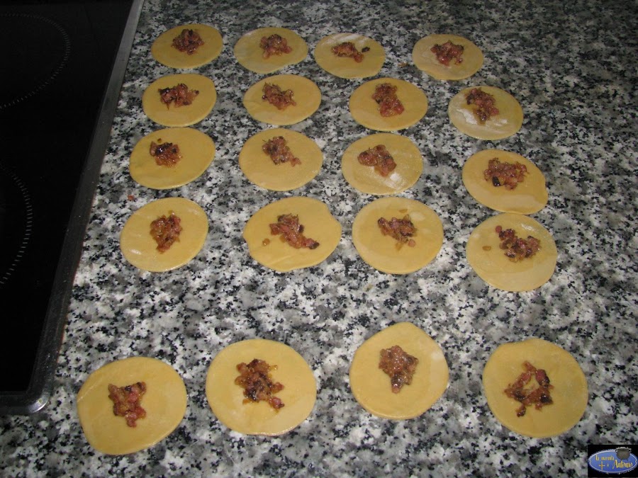 Ahora con ayuda de un corta pastas o un vaso pequeño.O lo que tengáis a mano hacemos círculos en la pasta para formar los tortellinnis.Y les vamos echando un poco del relleno.