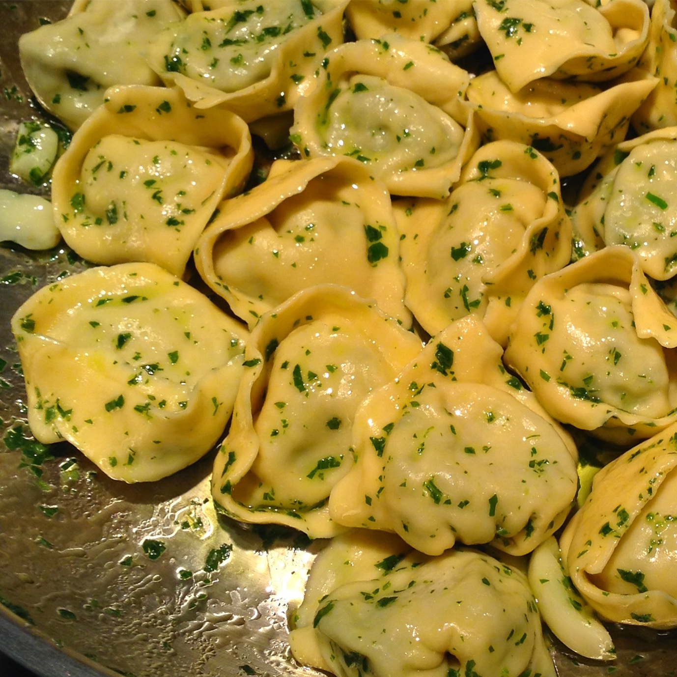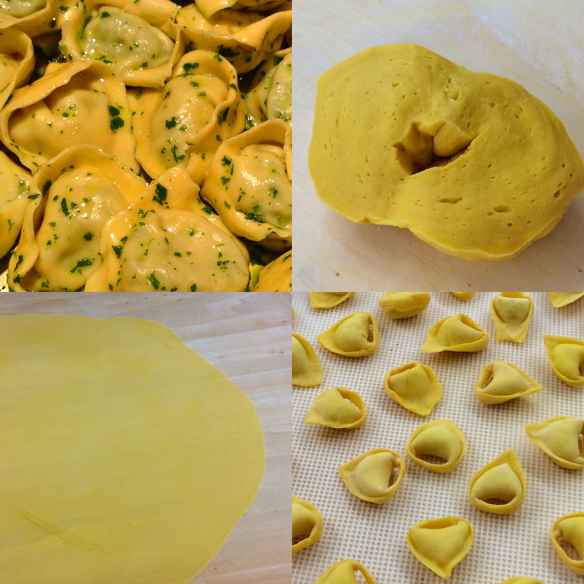 Para el impasto hacer una corona con el harina y en el medio añadir los huevos.Con un tenedor mezclar los huevos desde la parte interna de la corona hacia el centro integrándolos de a poco. En caso de ser necesario añadir más harina (no debe quedar blanda)Una vez formada la masa comenzar a amasar con la palma de la mano hacia adelante y hacia atrás. Como nos damos cuenta que esta listo el amasado? Cortamos parte del bollo por la mitad sin tocar el fondo, abrimos y si tiene burbujas dentro hay que continuar amasando (ver ejemplo en la foto).Una vez esté lista la masa dejar reposar media hora dentro de una bolsa de plástica.Mezclar en un bowl los ingredientes del relleno.Estirar la masa con un palote girándola siempre para el mismo lado, es decir, estirar, girar, estirar, girar. De esta manera de estira de manera uniforme.Cortar cuadrados de 5 x 5 cm.Con un pulverizador con agua rociar la masa.Añadir el relleno con manga o con una cuchara en cada uno de los cuadrados cortados.Juntar las puntas, sellar de a poco los bordes con cuidado para que no se escape el relleno. Una vez formado el triángulo unir las dos puntas opuestas para formar el tortelloni.Dejar airear.Cocinar en agua hirviendo con 10 gramos de sal por litro de agua.Cuando suben a la superficie pasar a una sartén, añadir aceite de oliva, un poco de agua de cocción y perejil picado.Listo! A disfrutar!