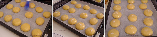 Preparamos una bandeja de horno con papel sulfurizado y colocamos las tortitas en ella, las pintamos con huevo y las espolvoreamos con azúcar.