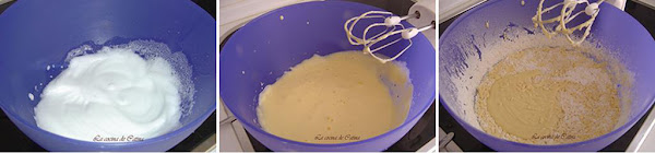 Separamos las claras de las yemas y las batimos hasta ponerlas a punto de nieve, entonces añadimos las yemas, el zumo de naranja y el aceite y seguimos batiendo. Mezclamos la harina con el Royal y el bicarbonato y la tamizamos. Incorporamos el azúcar y la mezcla de harina y amasamos.