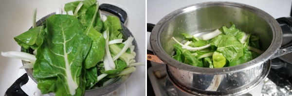 Para hacer la tortilla al horno lo primero empezaremos lavando las acelgas. Lavamos las hojas bajo el grifo una a una para quitar bien la tierra. Las cortamos en trozos y las vamos poniendo en una cazuela para ponerlas a cocer al vapor. Tapamos y las dejamos hasta que estén tiernas.